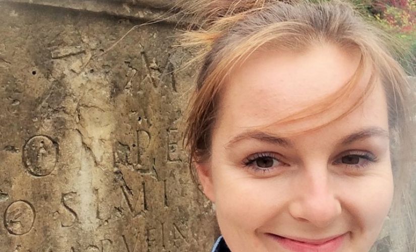 Zdjęcie portretowe: dr inż. Patrycja Baryła na tle skały z hieroglifami.