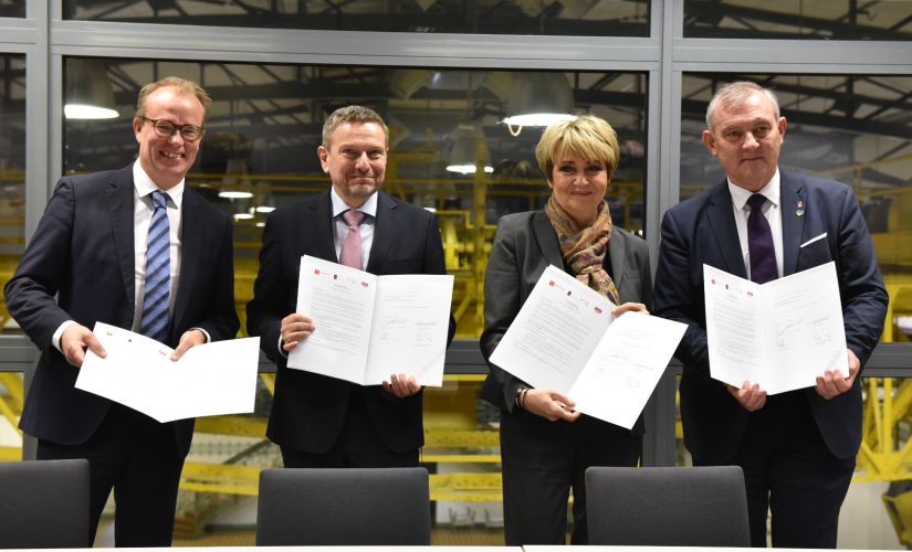 Czterostronne porozumienie w EC1 podpisali: Hanna Zdanowska, prezydent miasta Łódz, Ole Toft, ambasador Królestwa Danii w Polsce, prof. Krzysztof Jóźwik, rektor Politechniki Łódzkiej, Martin Rossen, Global Head of Public Affairs and Communication w Danfoss.